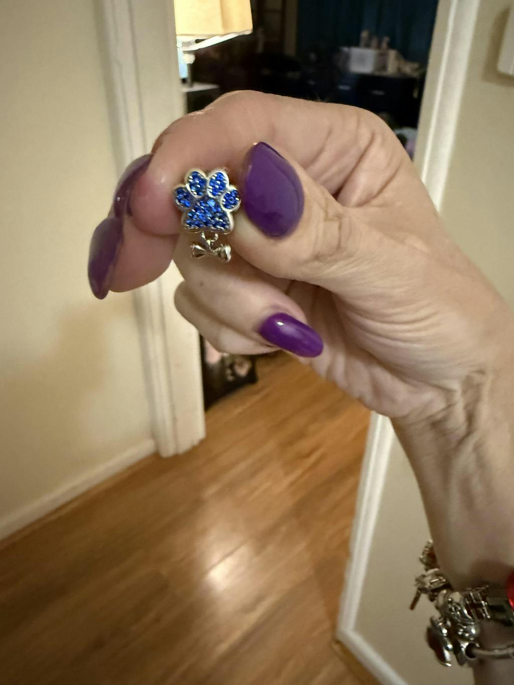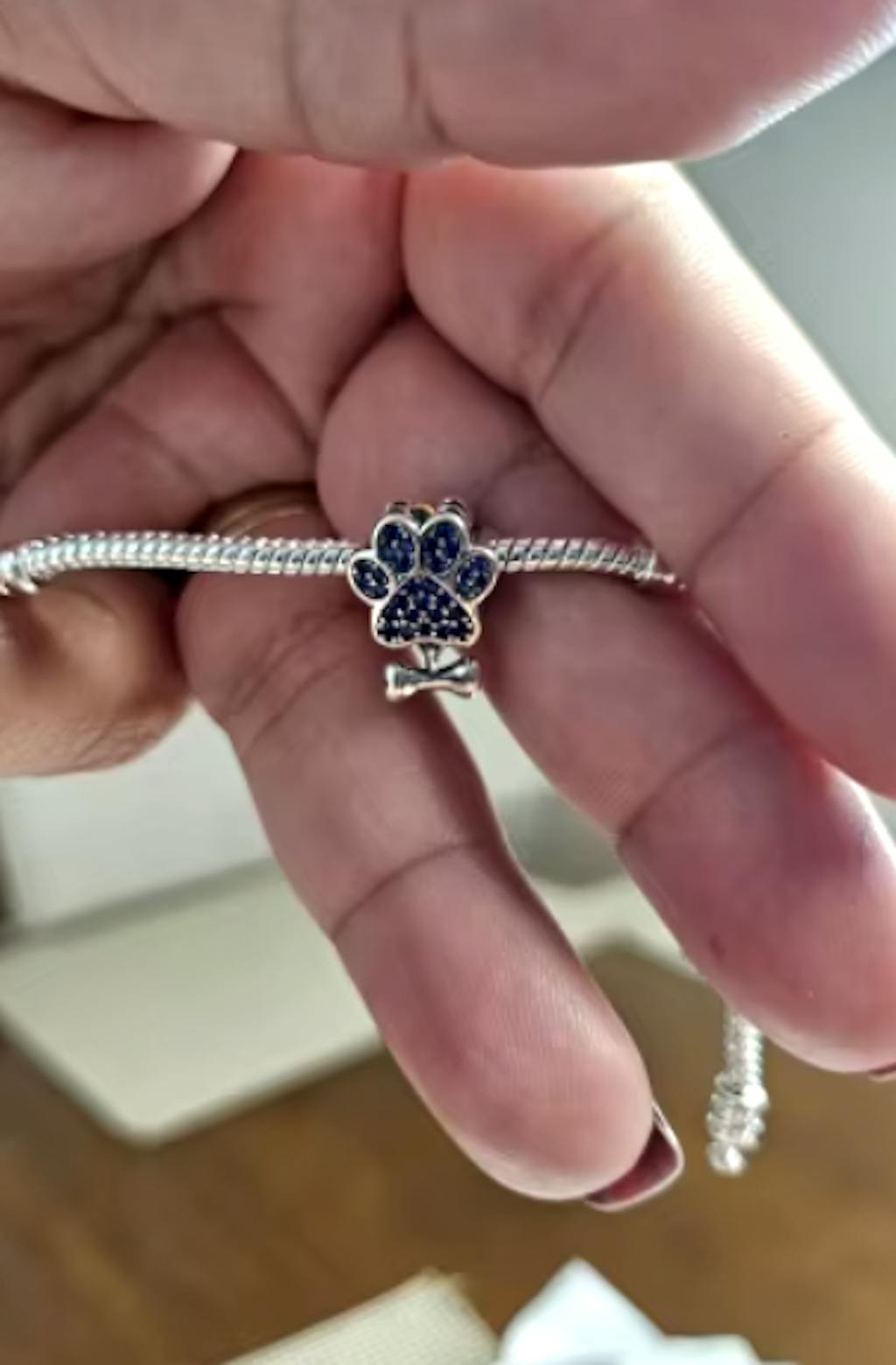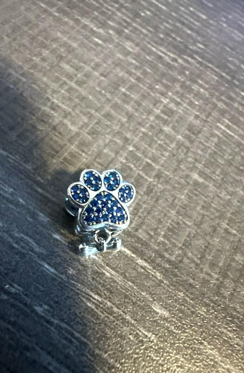 忠実な仲間への輝かしいトリビュート、Pangama Jewelryのブルードッグパウチャームは、925スターリングシルバーで作られ、きらめく青い石が足跡を形成し、小さなぶら下がる骨が付いています。このエレガントな作品は、四足の友を大切にする犬好きの方にぴったりです。