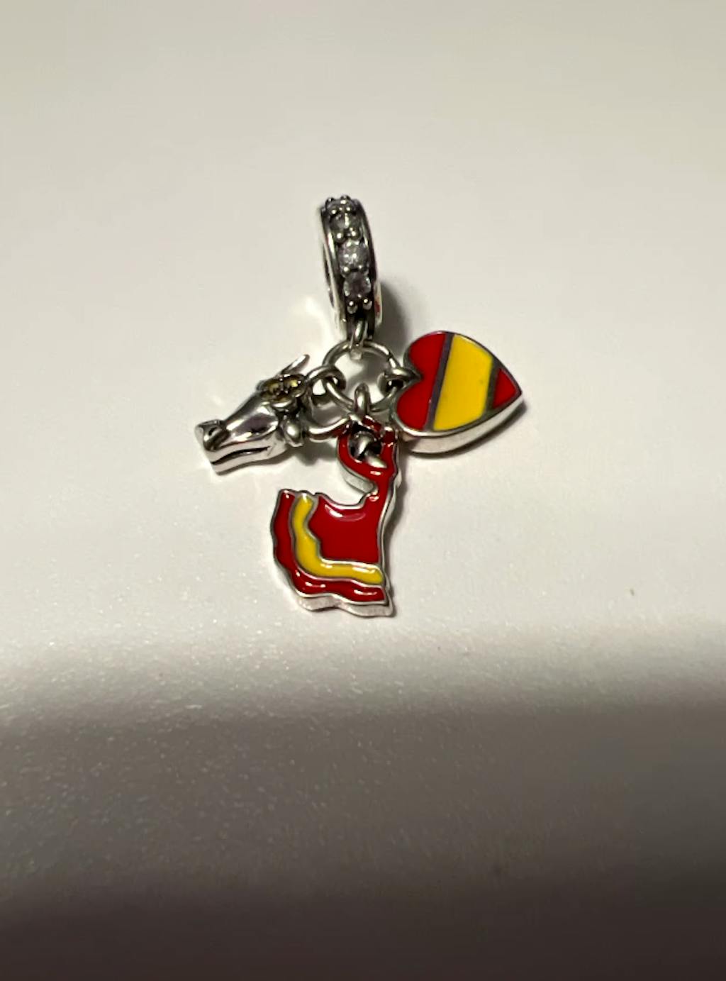 Omfavn den livlige kulturen i Spania med Spain Heart Flag, Flamenco og Bull Dangle Charm fra Pangama Jewelry. Laget av 925 sterling sølv, har denne charm en rød og gul hjerteflagg, en flamenco-dansers sko og en okse, som symboliserer lidenskap og tradisjon.