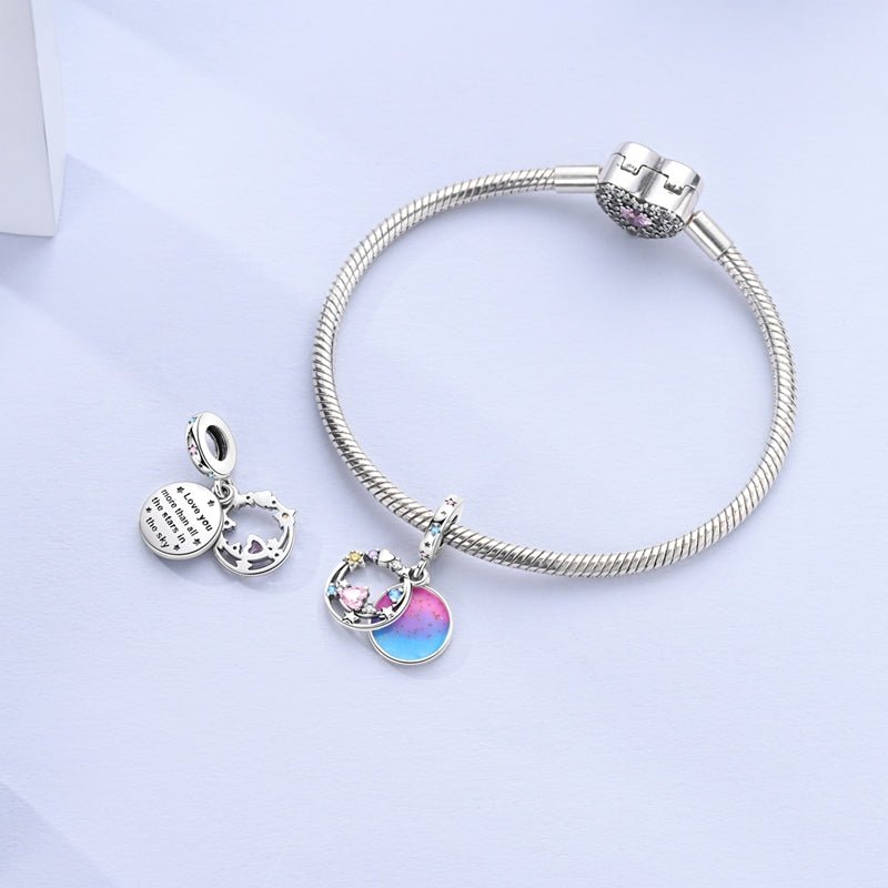 Embrace the magic of the night sky with the Cosmic Love Dangle Charm by Pangama Jewelry. Crafted from 925 sterling silver, this enchanting charm features a vibrant, iridescent moon with delicate stars, hearts, and sparkling gemstones in shades of pink, blue, and yellow. A stunning tribute to the beauty of the cosmos and the feeling of love that shines bright, this charm captures the wonder of a starlit sky, perfect for dreamers and romantics alike.