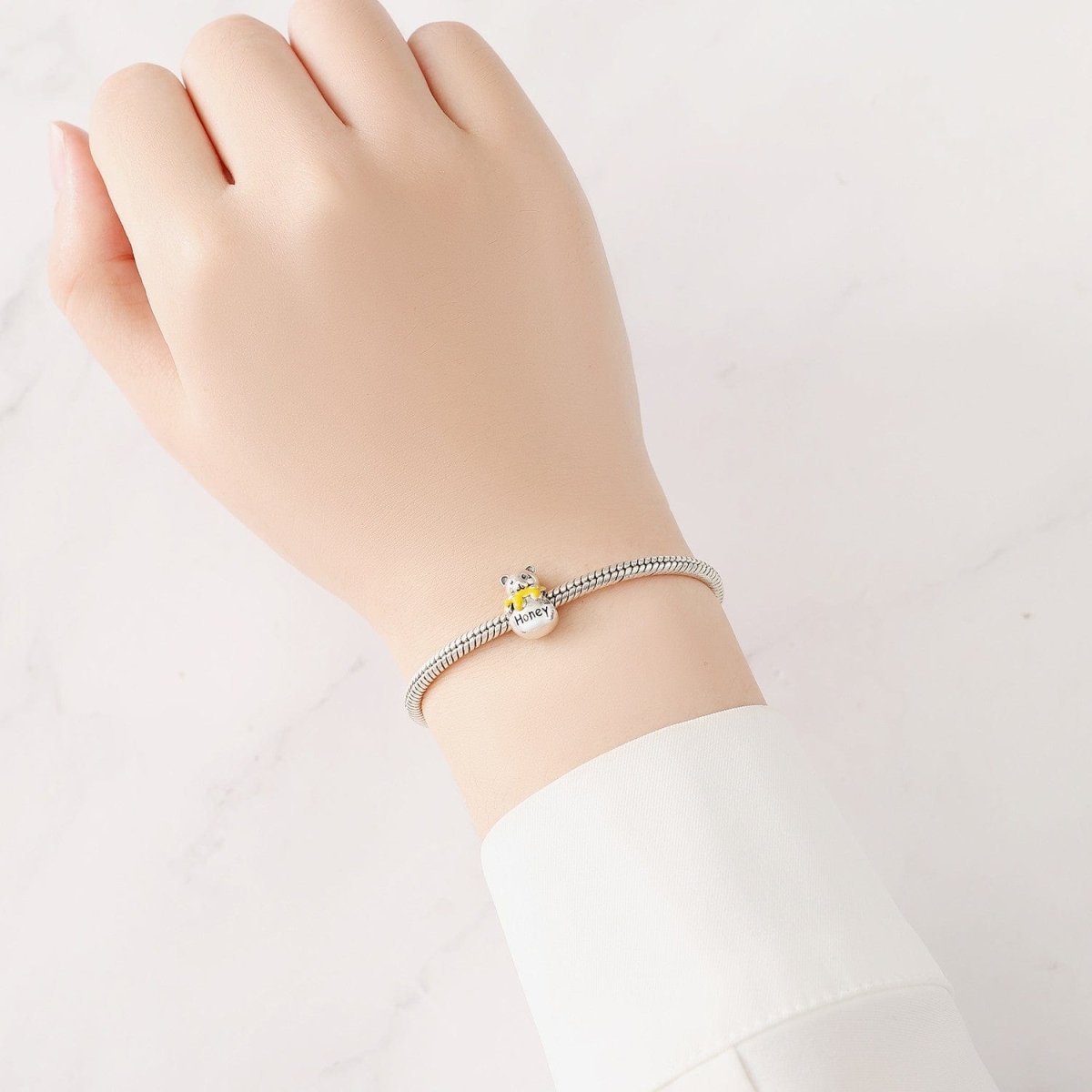 Îndulcește-ți colecția de farmecuri cu Pandantivul Dangle Honey Bear de la Pangama Jewelry. Fabricat din argint sterling 925, acest pandantiv adorabil prezintă un ursuleț drăguț cu un borcan de miere și cuvântul "Honey" gravat, făcându-l un cadou perfect pentru iubitorii de urși și miere deopotrivă.