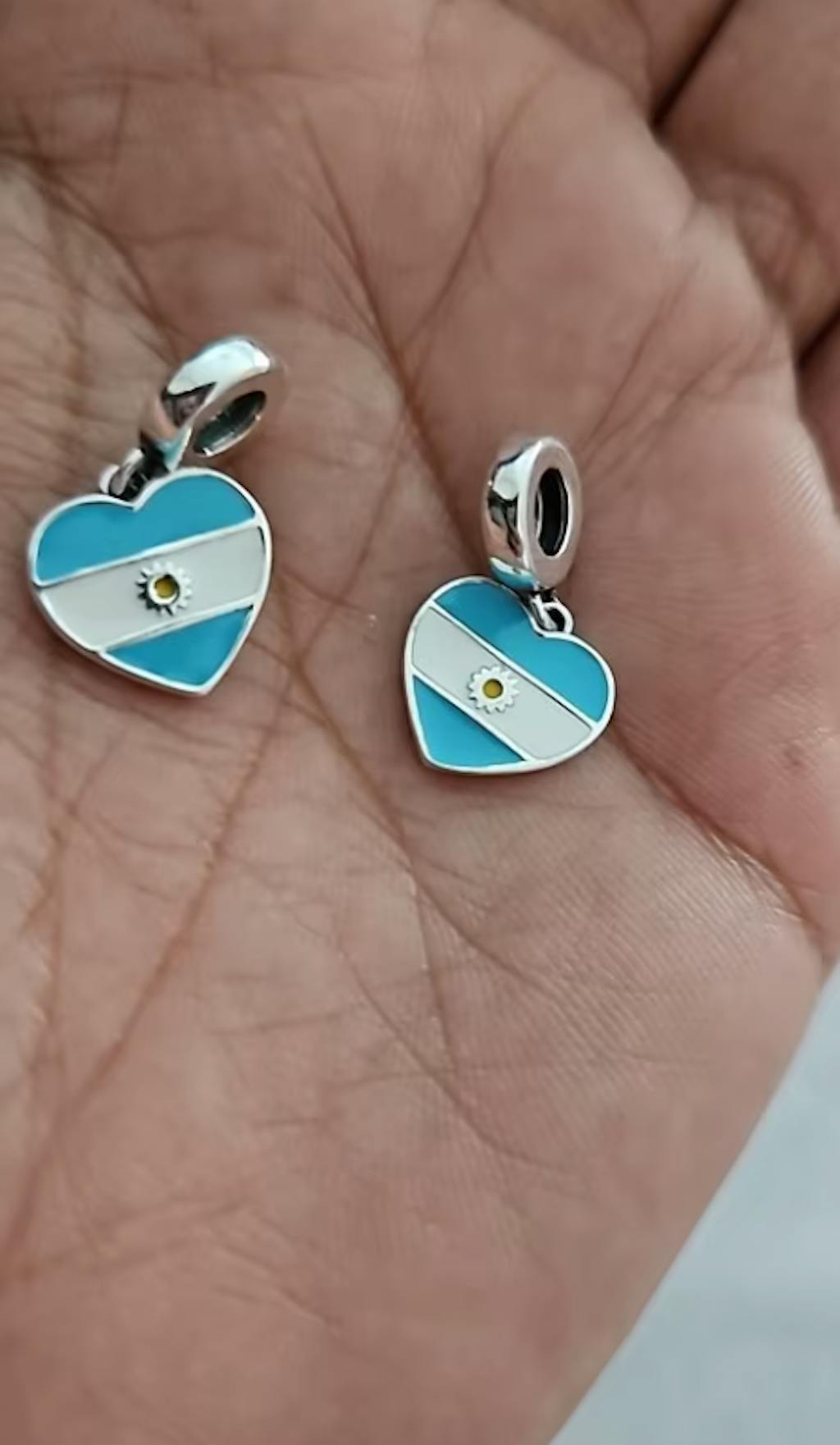 Visa din argentinska stolthet med Argentina Flag Heart Dangle Charm av Pangama Jewelry. Denna fantastiska charm i 925 sterling silver har de nationella färgerna i ett emaljhjärta, kompletterat med en ingraverad "Argentina" på baksidan, som symboliserar patriotism och kulturell arv.